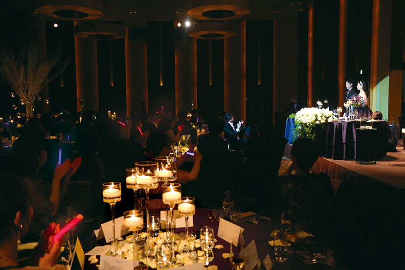 また披露宴では幅広い年齢層のゲストが楽しめるBGMをセレクト。司会者が歌うクリスマスソングも、ゲストが振るペンライトの輝きで本当のライブのように会場を沸かせた。