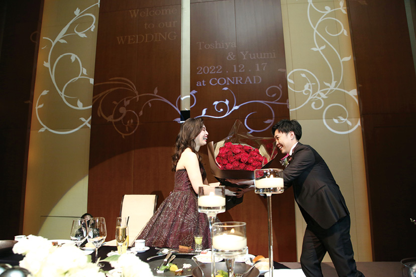 新郎から新婦へ、50本のバラに感謝を込めたサプライズも。