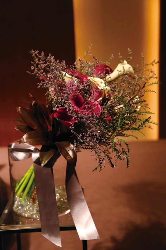 カラーの花がメインのシックなブーケは、リボンにシルバーをセレクト。