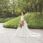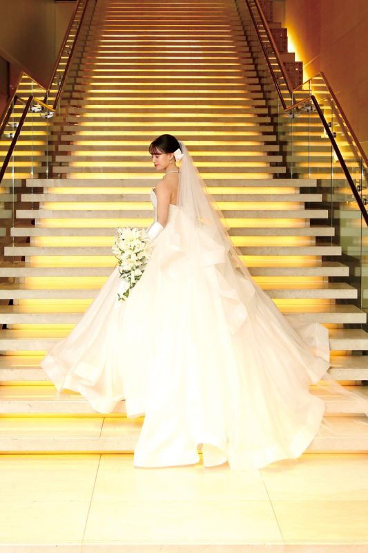 胸元がハートカットのAラインドレスは、憧れのANTONIO RIVA。華やかなバックスタイルをポイントに、ローシニヨンにリボンボンネをつけて、ロイヤル感を演出した。カサブランカのブーケは母と祖母の手作り。