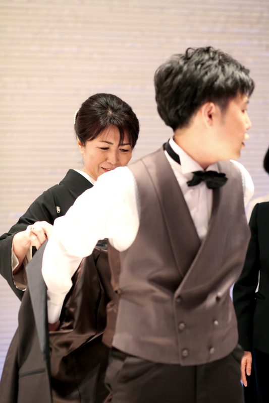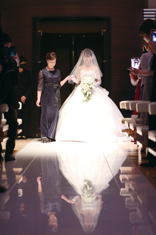 新郎は母とのジャケットセレモニー、新婦は女手ひとつで姉妹を育ててくれた母とバージンロードを歩み挙式がスタート。親孝行のひとつとなり、とても大切な思い出となった。