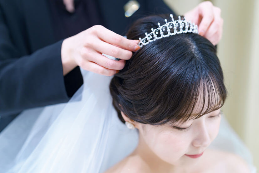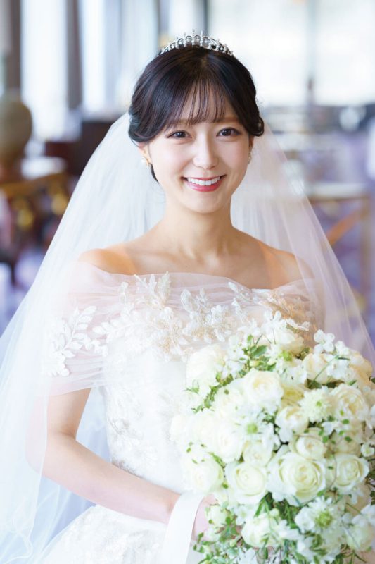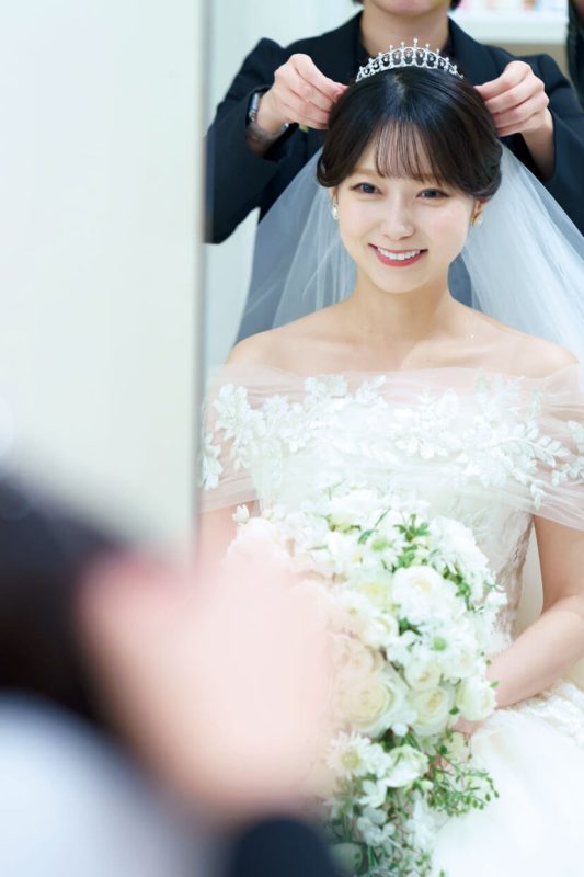 前髪や髪色との相性、ドレスとのバランスを大切に選んだティアラでイメージ通りの花嫁姿に。「ヘアメイクが終わった後、最後にティアラをセットした時の花嫁感がすごかったです!」と、大感激。