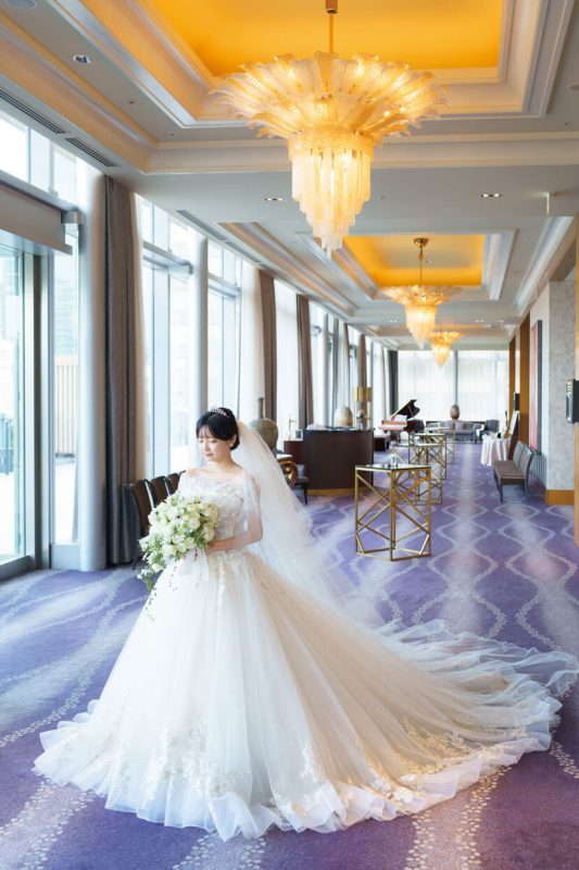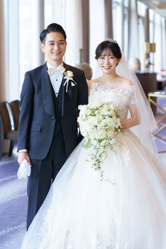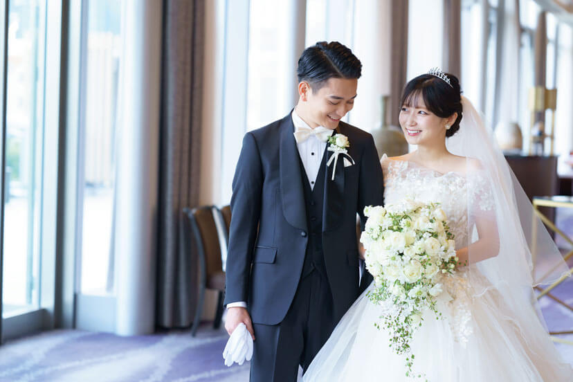 この日はじめてティアラ姿の新婦と対面した新郎は「おお!」と驚きの表情。「ザ・リッツ・カールトン東京」のフォトジェニックスポットで、幸せいっぱいの写真を残せた。