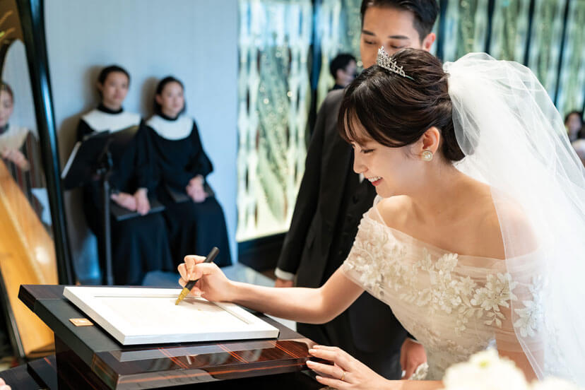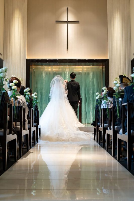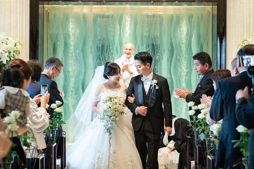 セレモニーはスワロフスキークリスタルのグラスアートに包まれた美しいチャペルで。ベールダウンでの入場にはじまり、新郎のベールアップ、フラワーシャワーなど、さまざまなシーンで、揺れ動くダイヤモンドティアラの輝きが豪華な雰囲気を演出してくれた。