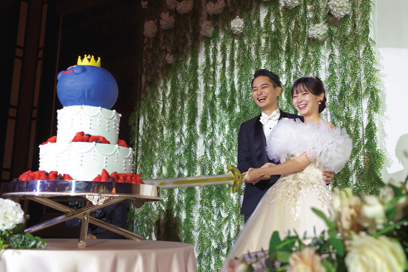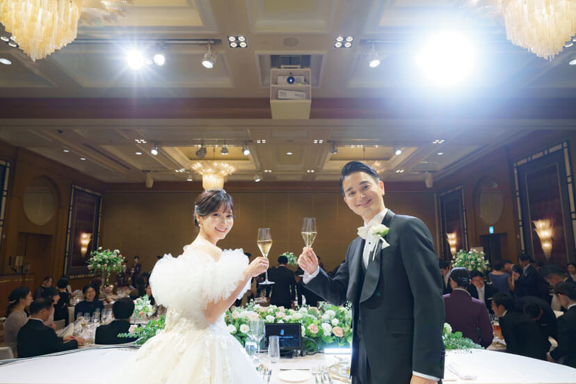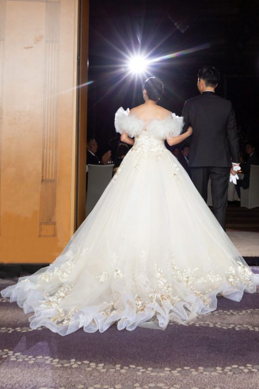 入場・乾杯・ケーキカットと、スポットライトやシャンデリアの光を浴びてダイヤモンドティアラの煌めきも最高潮に。髪型をハーフアップにして雰囲気を変えたお色直しでは、ティアラがあったことでその変化が強調され、ゲストからも好評だった。