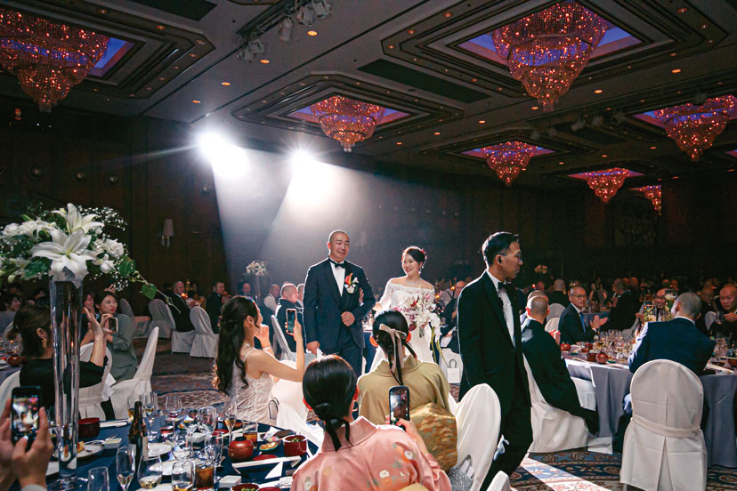 「中部の迎賓館」といわれ、多くのVIPをもてなしてきたホテルのバンケット。メインテーブルで笑顔のふたり。広々とした空間においてもライトを浴びてダイヤモンドティアラが煌びやかで、花嫁の美しさがゲストを魅了。