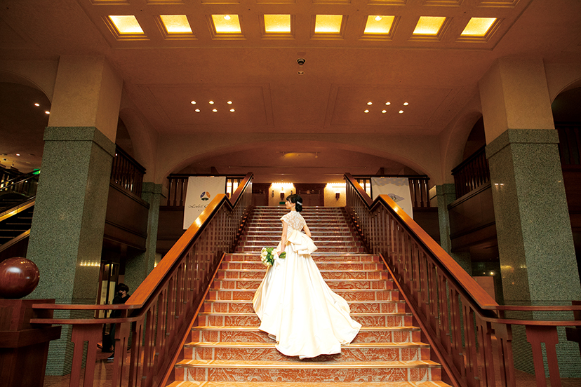木の温もりと落ち着いた色合いで気品が漂うロビーの大階段に映えるクラシカルな印象のドレス。ロングトレーンが描く優雅なラインも素敵。
