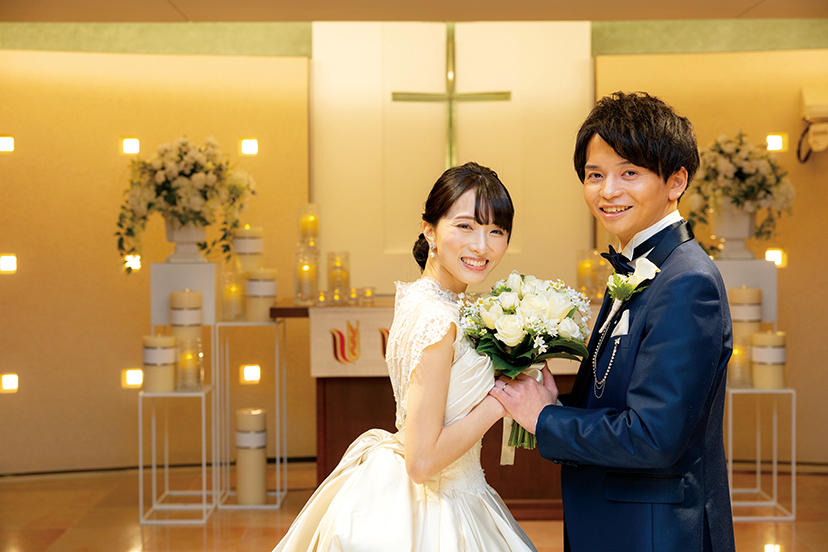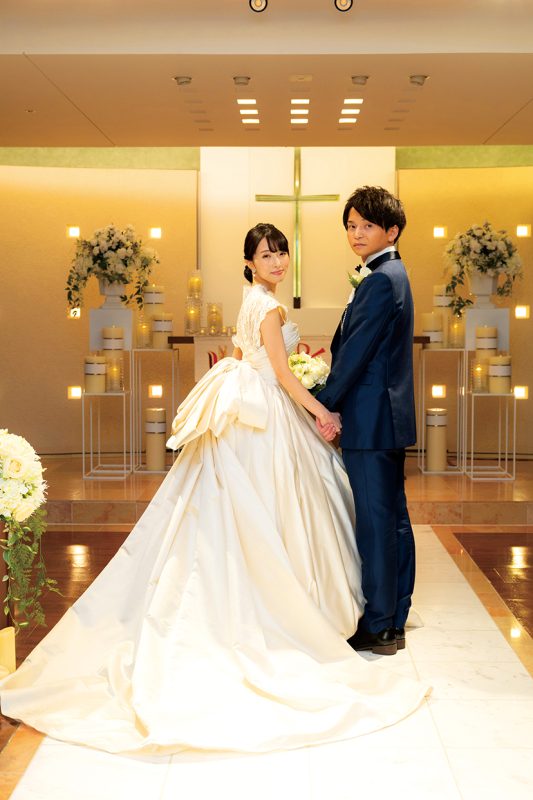 照明を落とし、祭壇の光と艶やかなドレスが映えるロマンティックな1枚。ボリュームたっぷりのスカートに華やぐリボンも愛らしい。