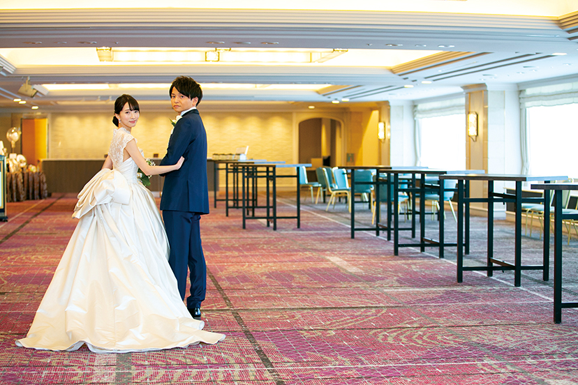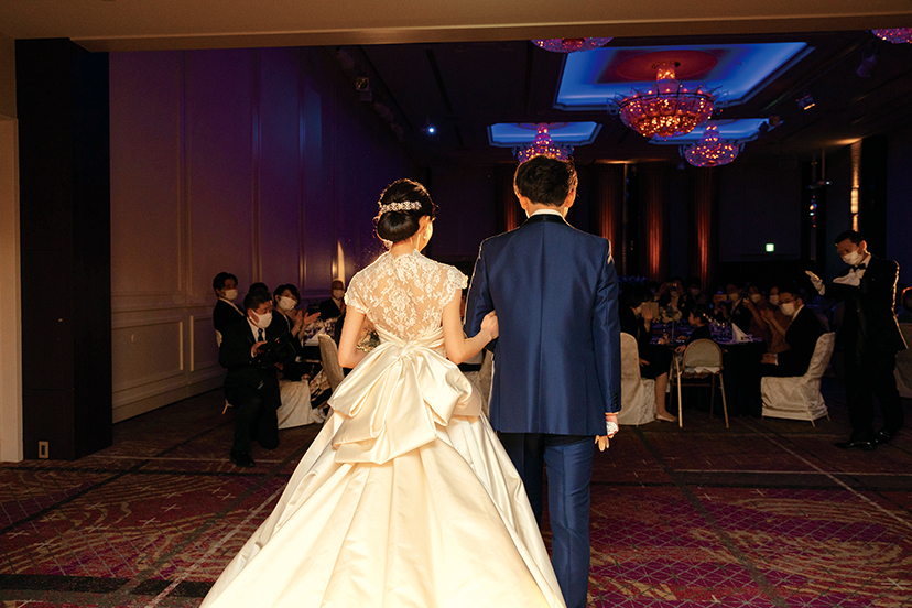 新婦は京都の大学に進学した頃から京都での結婚式に憧れ、ウエディングドレスを着るのが夢だったという。参列経験が多い友人にも楽しんでもらうため、〝今までにない演出が叶う〞をコンセプトに会場探し。出合ったのが「ホテルオークラ京都」で唯一、プロジェクションマッピングが行える会場「暁雲」。入場や乾杯、手紙の朗読などのシーンを、花火やランタンの映像でドラマティックに彩った。また料理にもこだわりの演出を。試食会で総料理長からの料理説明を聞き、より料理が美味しく感じたことから自身の祝宴でもとリクエスト。前菜のフォワグラを女性でも食べやすい真鯛のカルパッチョに変更するなど、一皿ひと皿のこだわりを総料理長が紹介し、ゲストのワクワク感を高めた。さらに迫力ある炎で魅せるクレープシュゼットのフランベサービスも。ひと工夫加えたファーストバイトやクイズなど、終宴まで会場を沸かせた。ドレス姿も披露でき両親に喜んでもらえた披露宴。久しぶりに集まった友人たちへ、直接感謝を伝えられたことも最高の思い出となった。(Hotel Wedding WEST&TOKAI 14号掲載)