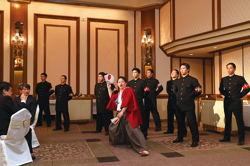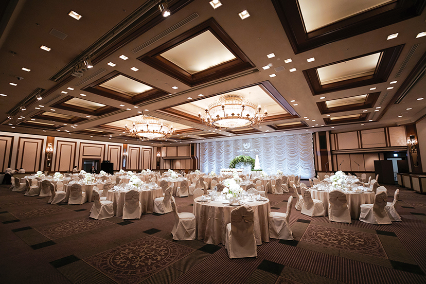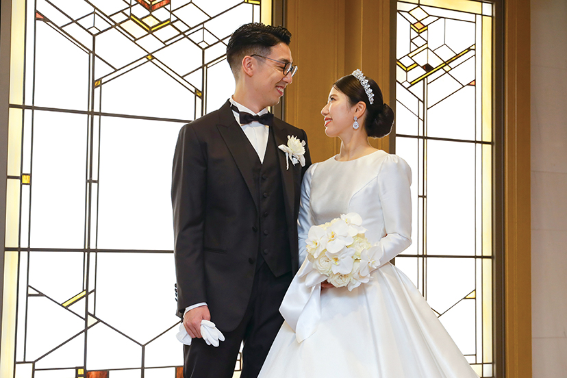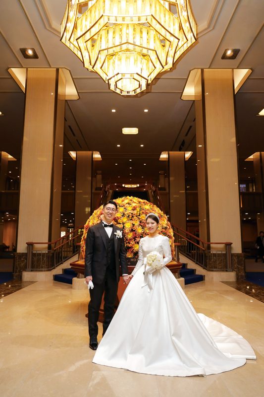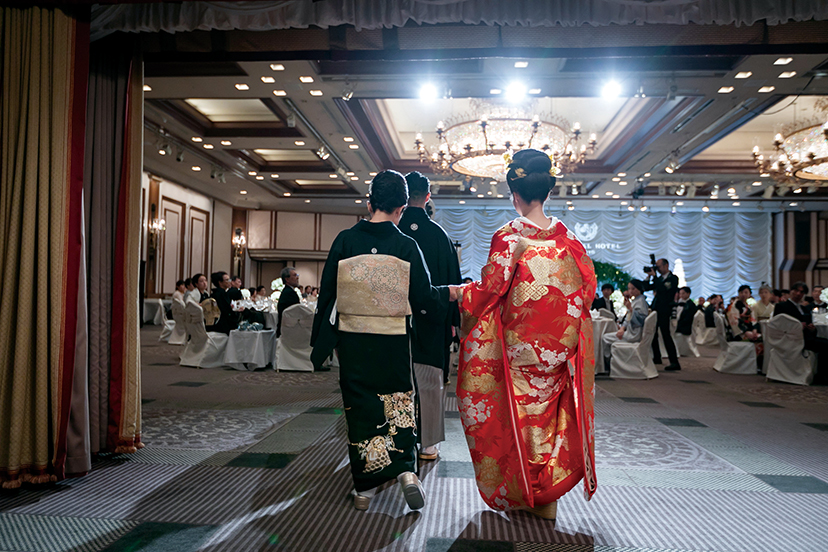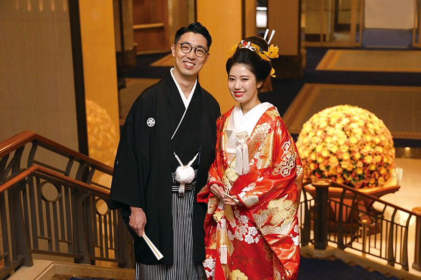 大学の部活で出会ったふたりは、九年間の愛を育み入籍。日本髪に憧れていた新婦は、新郎家族が代々神前式を行った「帝国ホテル 東京」での結婚式を迷わず決めた。和装では地毛で日本髪を結い、地毛では難しいとされる角隠しも、入念にリハーサルを行い美しく仕上げた。披露宴は粋な掛け声と共に始まる木遣りを先導に、艶やかな色打掛で登場。学生時代の友人たちを中心とした180 名ものゲストには、新婦が学生時代に毎朝聞いた懐かしい曲の生演奏や、迫力ある応援団のエールなど、ライブ感満載の余興を楽しんでもらった。おもてなしの料理は、何度も試食を重ねたなかで一番美味しかったものをセレクトし、器や盛り付けにもこだわった。デザートの「ダークチェリーとフランボワーズのジュビレ」は、幻想的な炎に歓声があがるほど好評の演出に。会場に入った瞬間に目に入る大きなシャンデリアとインペリアルホテルのロゴライティングが映える豪華で盛大な祝宴に、たくさんのうれしい感想が。この結婚式でふたりの信頼や絆がより深まった。(Hotel Wedding 54号掲載)