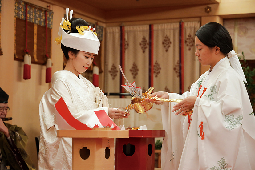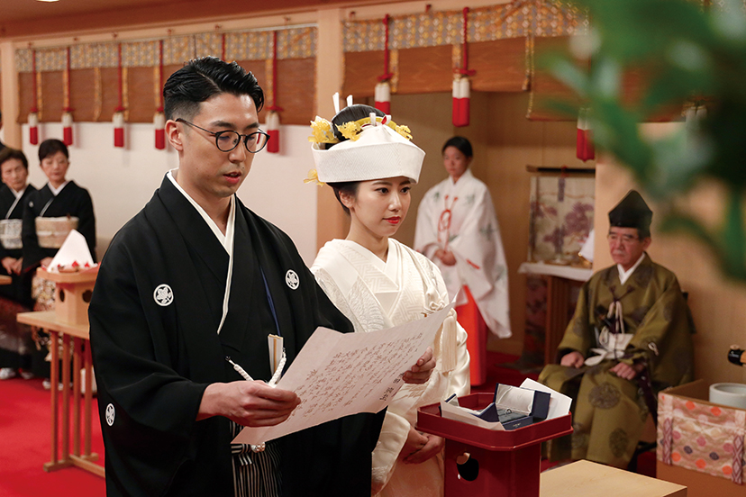 雅楽の生演奏のなか執り行われた日本の伝統美に包まれる厳かな神前式。