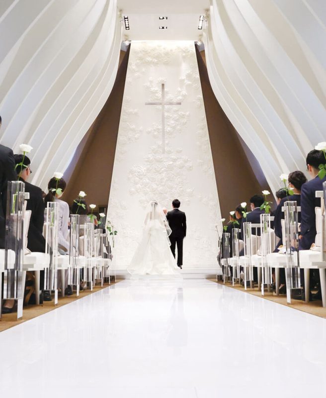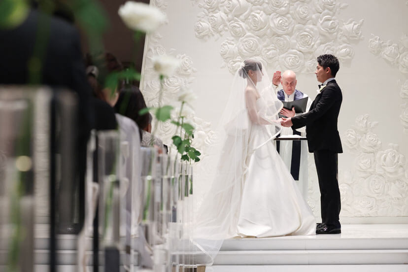 挙式は「ホワイトローズチャペル」で。入り口から祭壇までのバージンロードは、バラがつぼみから開花するまでの様子を表現。かなり緊張していたという新郎だが、バージンロードを歩く新婦がとても綺麗だったことが今でも記憶に残っているそう。挙式のBGMもセットリストを作成。