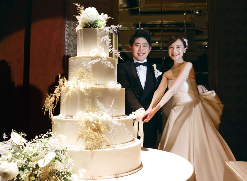 ブライダルフェアで体験した「グランド ハイアット 福岡」のバンケットや大型マルチビジョン、上質なコース料理がとても印象的で、参加した日に即決で申し込みをしたというふたり。祝宴の舞台になった披露宴会場は、ホワイト×シルバー・ゴールドをテーマカラーに、優美で品のある雰囲気が漂いながらも、格式張らずに楽しめるよう絶妙なバランスでコーディネート。グルメとお酒が趣味のふたりらしく、試食で気に入った各コースのメニューから組み合わせてアレンジしたコース料理や、誰もが楽しめるバリエーションに富んだBGMで大切なゲストをもてなした。新婦同僚が制作したプロフィールムービーや、新郎が新婦の学生時代の友人からメッセージを集めたサプライズムービーを上映するなど、「愛と笑顔」「美味しく楽しく」がコンセプトの明るく華やかなウエディングパーティを叶えた。結婚式は悩んで迷ってたくさん考えて準備をしてきたからこそ、当日の満足があり、「準備へのこだわりが結婚式の思い出の余韻の長さや濃さへ繋がる」と語ってくれた。