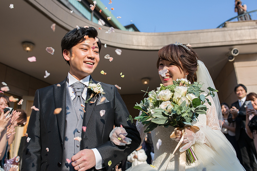 緊張の挙式後は、ゲストの温かいフラワーシャワーの祝福で自然と笑みがこぼれる。