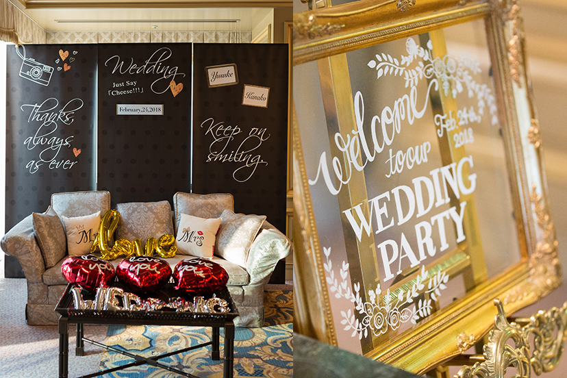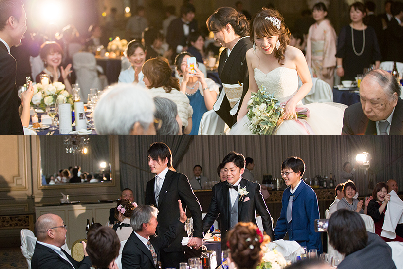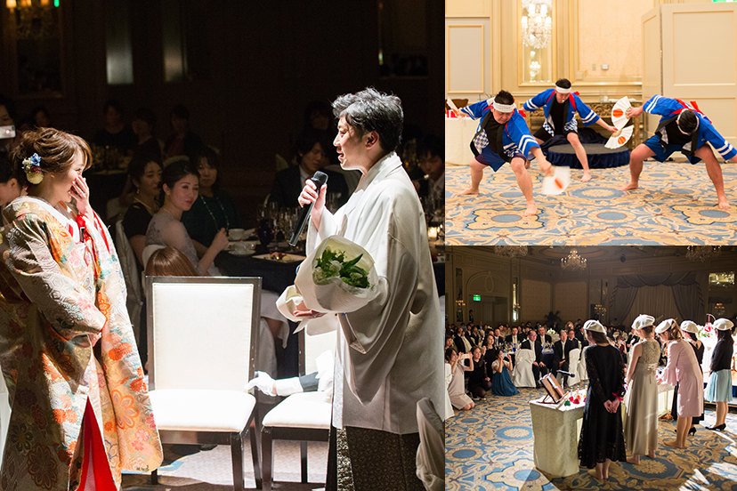 披露宴では沢山の友人の協力もあり、賑やかな余興で笑いが溢れ、新郎から新婦へのサプライズプロポーズがあったりと、感動的なパーティとなった。