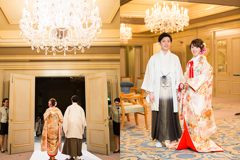 白地にオレンジとゴールドの刺繍が施された華やかな色打掛け。シャンデリアの煌きでより一層美しい花嫁に。