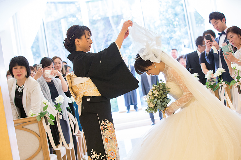 お嫁に行く前の最後のセレモニーは、今まで大切に育ててくれた母親からのベールダウン。結婚式の時には絶対にしたいと決めていた。