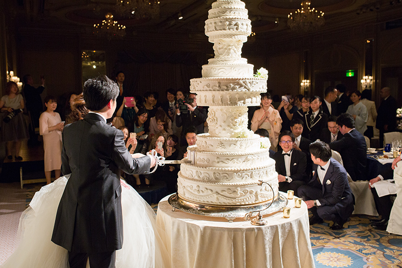 ラグジュアリーな会場に合わせてチョイスした存在感抜群のオーナメントケーキ。多くのゲストがカメラを構えた。