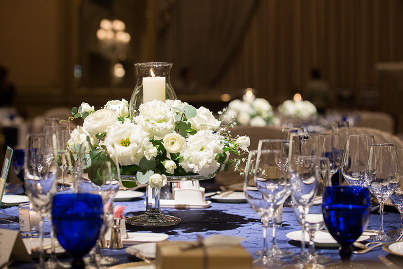 ネイビー×ホワイト×グリーンを基調としたエレガントな雰囲気に。キャンドルやブルーゴブレットを取り入れた。