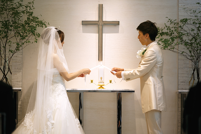両家から受け継いだキャンドルをふたりで灯す「ユニティキャンドル」のセレモニー