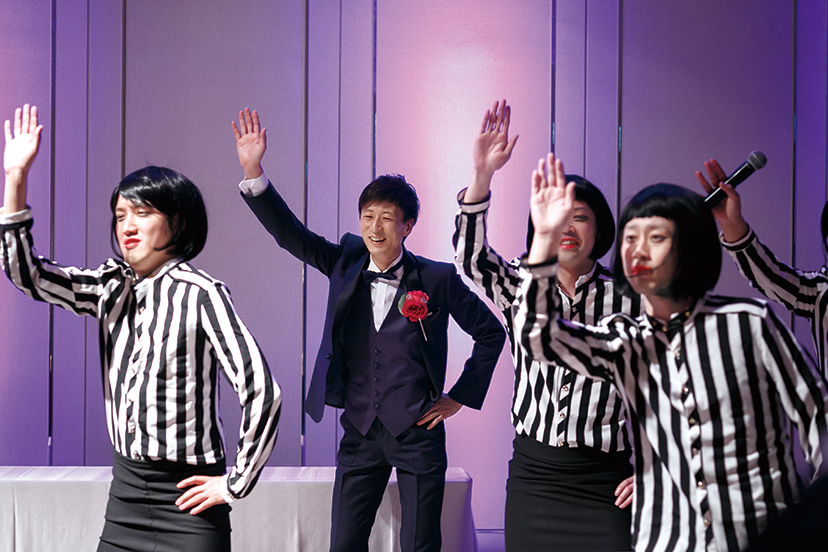 新郎友人による余興は、途中から新郎も参加して盛り上がる