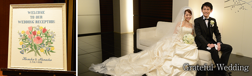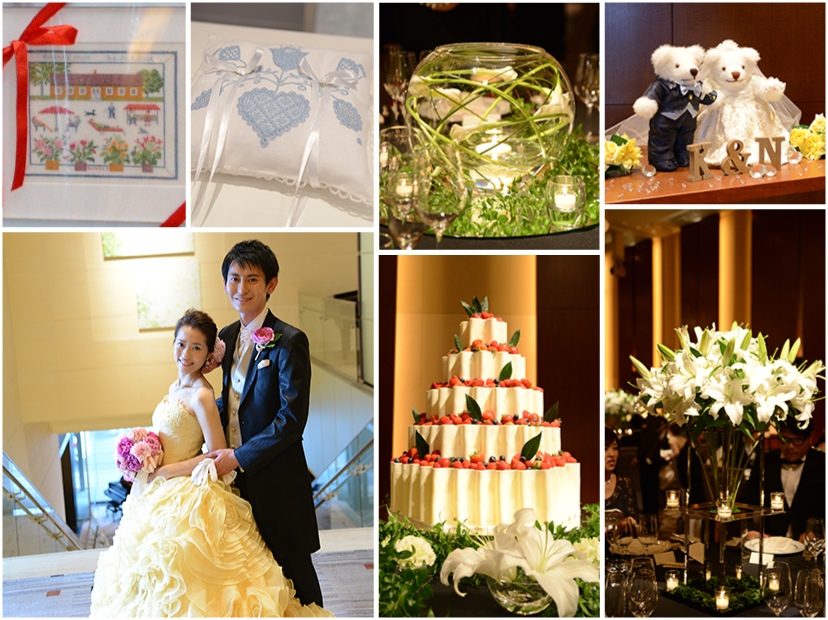 ふたりのお気に入りのポイントである会場装花は、シックですっきりとした印象を与えながらも、洗練されたコーディネートに。お色直しでは柔らかいイエロードレスにチェンジ。パーティに華を添えるケーキはふたりの好みに合わせてホワイトチョコで作られたもの。リングピローやウエルカムボードは、刺しゅうの先生をしている新婦お母様の手作り。新婦から両親へサプライズで刺しゅうのプレゼントに、感動の涙が溢れた。