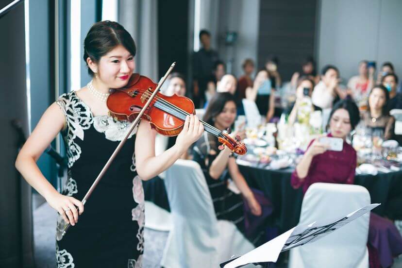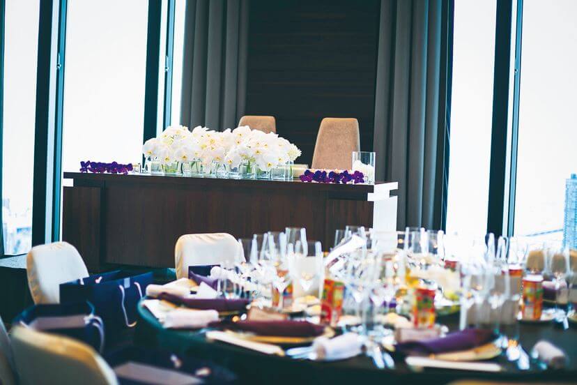 コンラッドのブランドカラーのバイオレットと胡蝶蘭でスタイリッシュな空間に