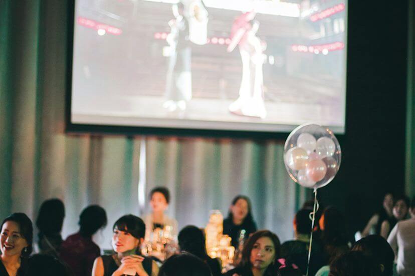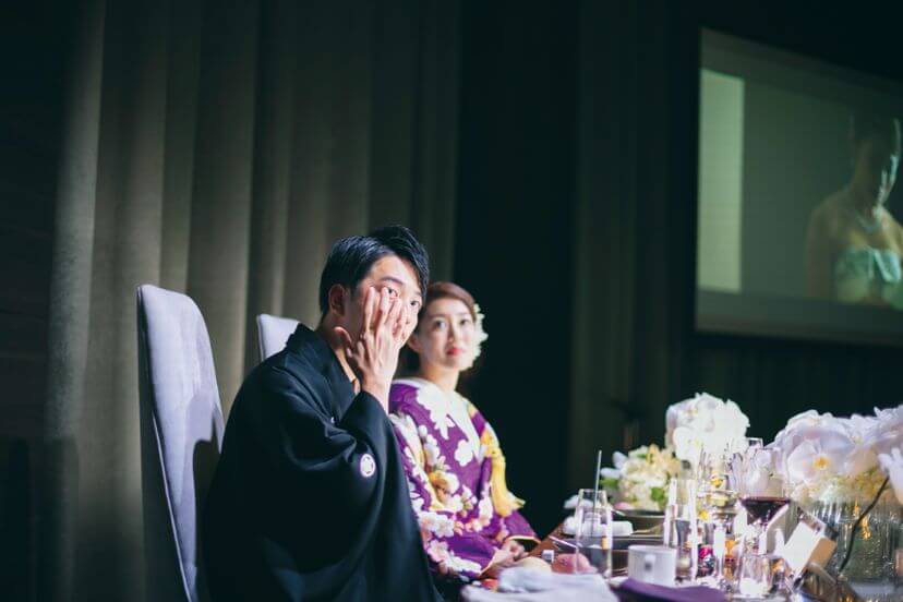 サプライズで当日作成した新婦から新郎への誕生日のお祝いムービー。ゲストや関係スタッフのコメント、新婦のメッセージに新郎は大号泣