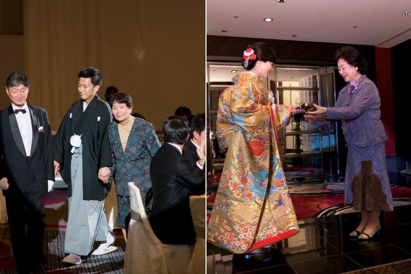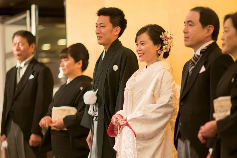 両家両親とともに金屏風前に立ち、ゲストをお出迎え