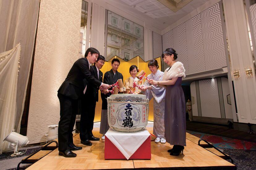 新婦地元の銘酒をお世話になった上司や友人とともに鏡開き。絆が深まった瞬間