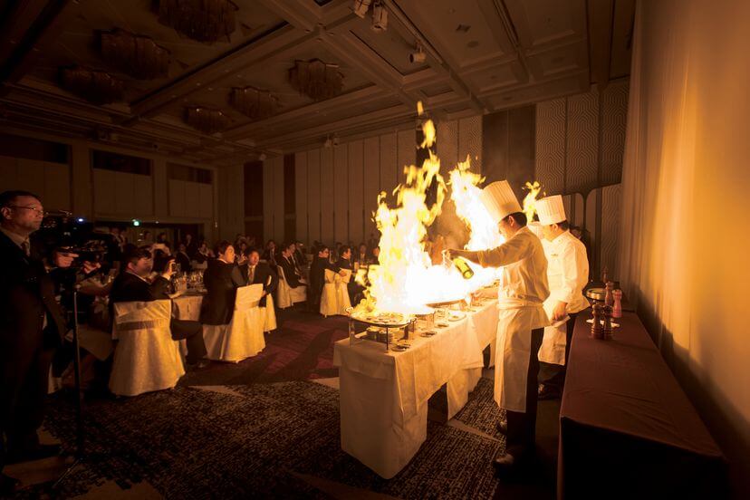 ステーキのフランベ演出は、立ち上る炎の迫力にゲスト全員が圧倒された