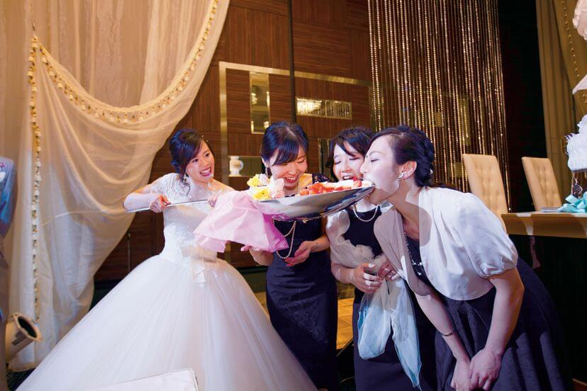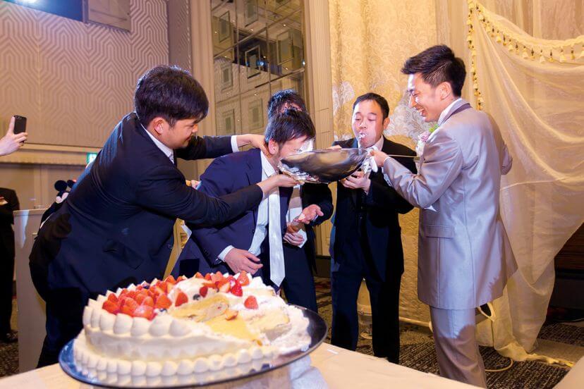 超巨大スプーンに3人同時に「ガブりっ」!新郎友人は顔面ケーキまみれになり、会場が爆笑の渦に