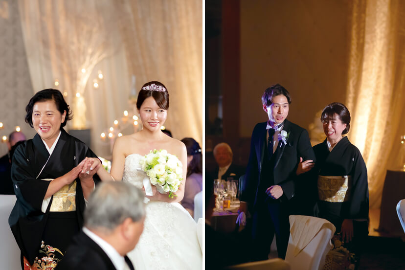 新郎新婦はそれぞれお母様と一緒に退場。この日が誕生日だった新婦のお母様はゲストに祝われ嬉しそうな表情