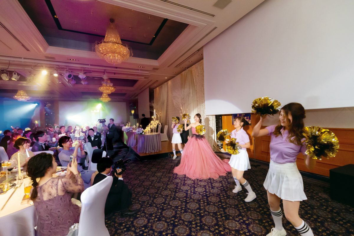 ケーキ入刀では大好きな曲をBGMにしてノリノリの雰囲気に。ファーストバイトではカメラに囲まれて芸能人気分も味わえたそう