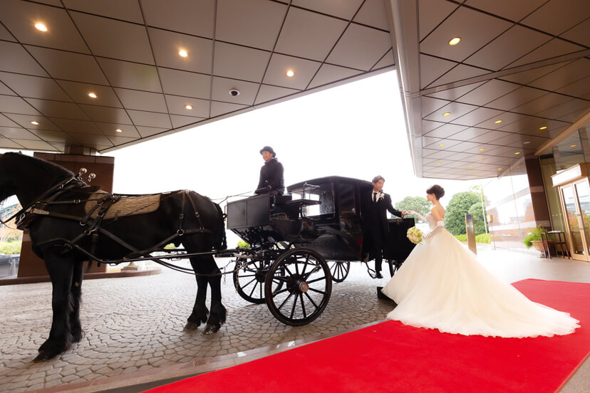 本格的な馬車が登場してゲストも驚いたというホースパレード。トランペットのファンファーレで正面玄関を出発