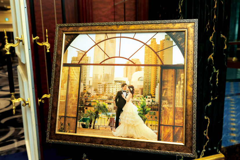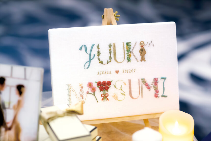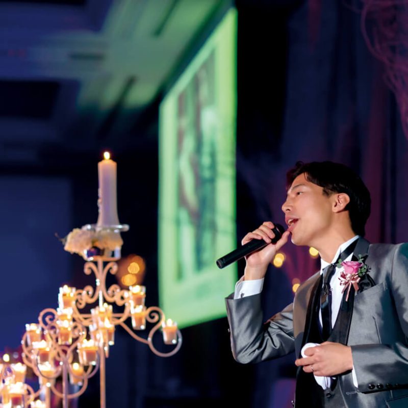 新郎のサプライズムービーでは、新婦の元上司からのビデオレターに思わず号泣。さらに新郎の歌に合わせて交際4年間の写真が映され感激のサプライズ演出に