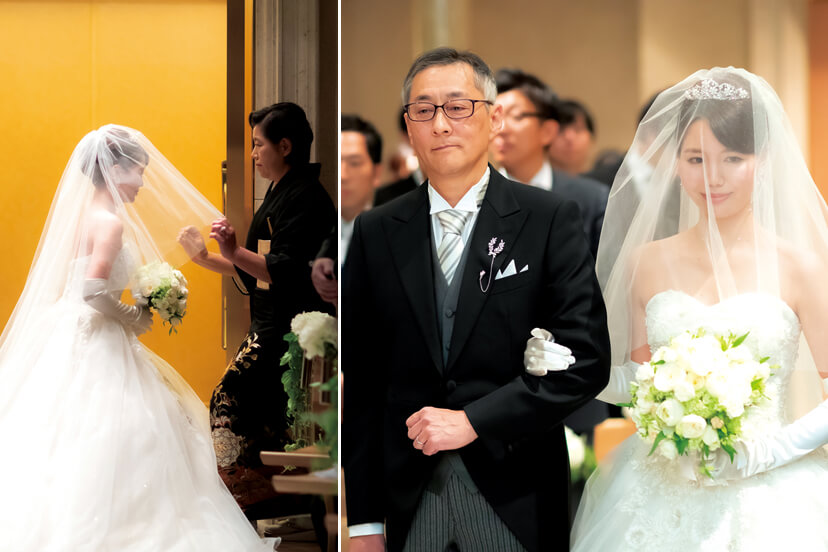 ゲストに見守ってもらいたかったと、チャペル内でお母様にベールダウンをしてもらい、お父様とバージンロードを進んだ
