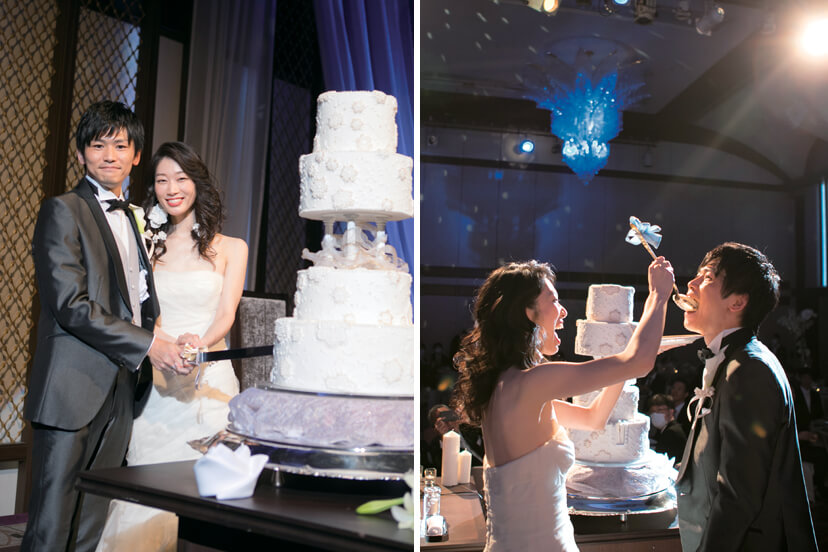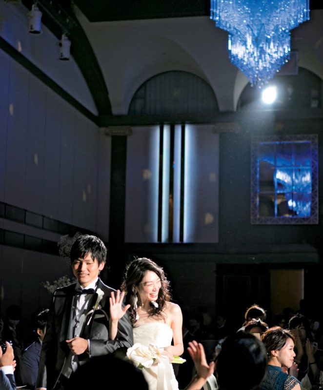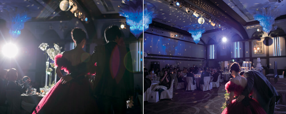 ふたりの入場に合わせ、シャンデリアが青色に変わり、ミラーボールが回る豪華演出