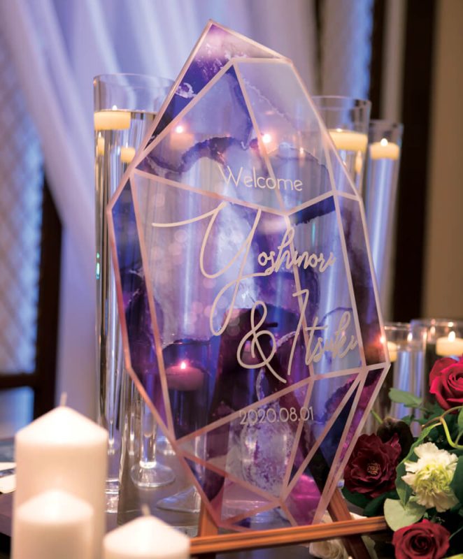 鉱物が大好きという新婦。鉱物を模したウェルカムボードは打ち合わせを重ね仕上げたオーダーメイド