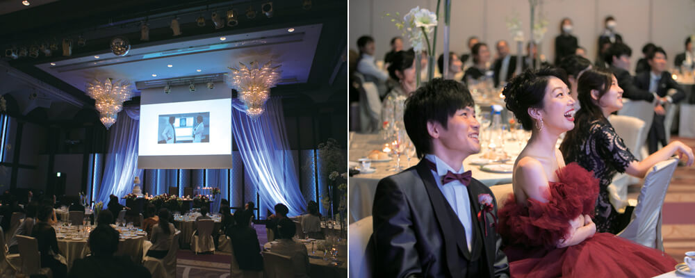 スクリーンを使った余興演出。新郎新婦もゲストと一緒に映像を楽しんだ