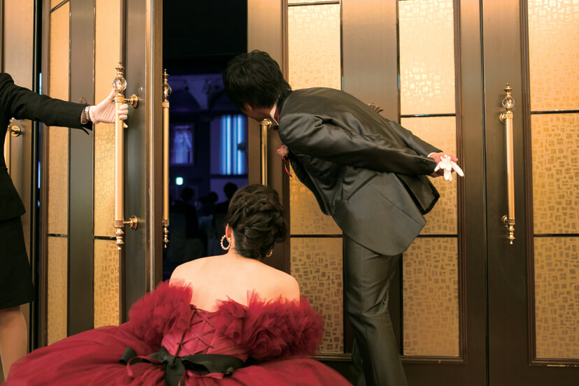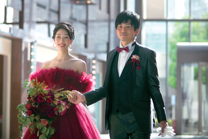 お色直し後の再入場シーン。胸元のチュールが印象的な赤ドレスに。テーブルラウンドでは、ゲストとの会話や写真撮影を楽しんだ