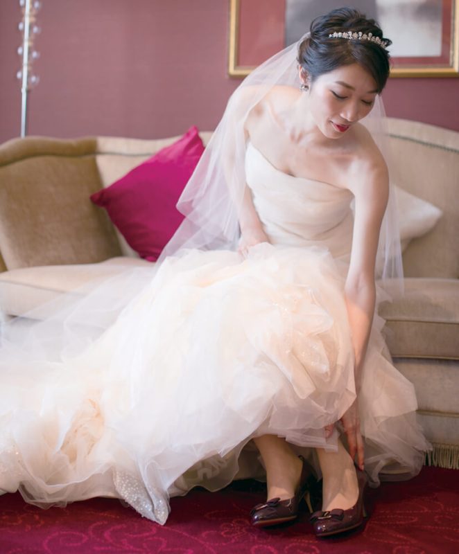 新郎から贈られた「フェラガモ」のボルドーの靴を合わせた
