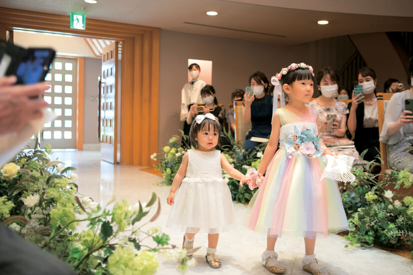 新婦の姪が新郎の姪の手を引き、リングガールの大役を見事に果たした