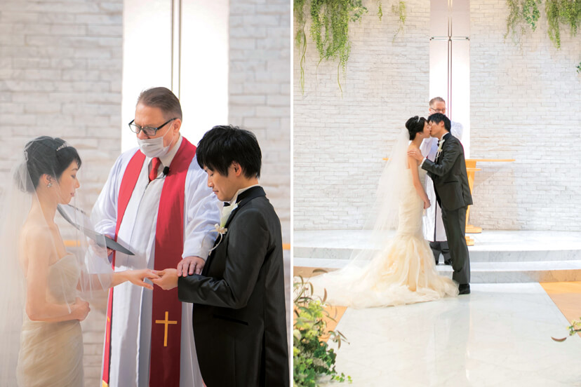 挙式は生演奏が響き渡る独立型チャペルにて厳かに執り行われた。母によるベールダウンシーン