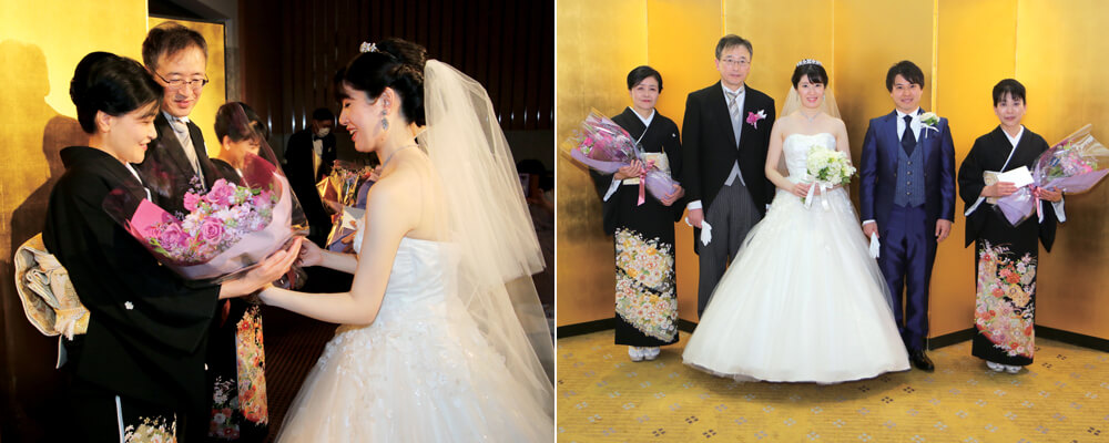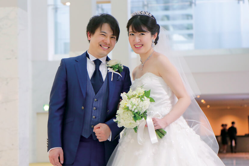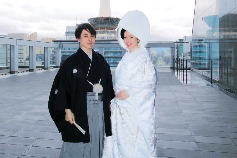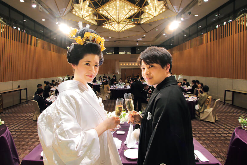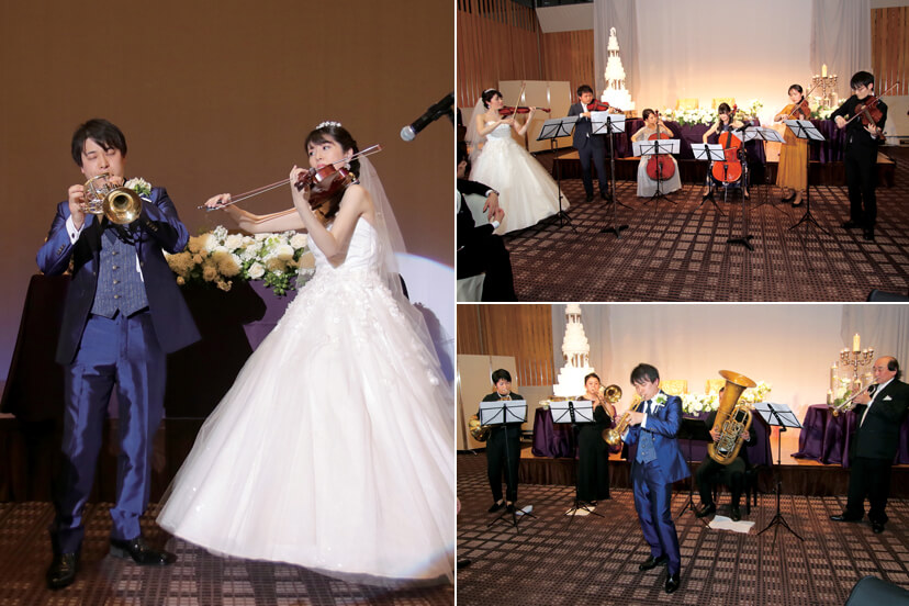 大好きな街·京都で、クラシカルな大人の結婚式を挙げたいと、ふたりが選んだのは『ホテルグランヴィア京都』。格式の高さに加え、京都駅直結というアクセスの良さも決め手になった。かねてより和婚に憧れていたという新婦。日本の花嫁らしく白無垢と綿帽子を身にまとい、由緒正しい『伏見稲荷大社』のご祭神を祀った館内の神殿で、伝統的な儀式を執り行った。ともにアマチュアオーケストラに所属し、音楽活動を行うふたりの祝宴のメインイベントは、新郎新婦による生演奏。それぞれが音楽仲間と共に曲を披露し、軽快な曲で会場を楽しく盛り上げたり、ゆったりとした曲で寛ぎの時間を演出した。最後は、新郎のトランペット、新婦のバイオリンによるデュエットを披露。限られた時間のなかで精一杯練習し感謝の気持ちを込めた演奏は、ゲストの心に響き、涙を誘った。「本当に良かった」「感動した」というたくさんの声をもらい、ふたりにとっても最高に幸せな時間となった。披露宴後はホテルに宿泊し、京都の美しい夜景を眺めながら、ゆっくりと余韻を楽しんだ。