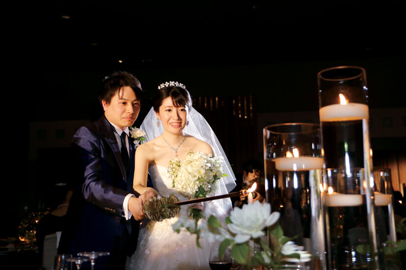 お色直し後はウエディングドレスで登場。キャンドルの幻想的な光に照らされ、ハイブランドのティアラと、ドレスに施されたグリッターが美しく煌いた