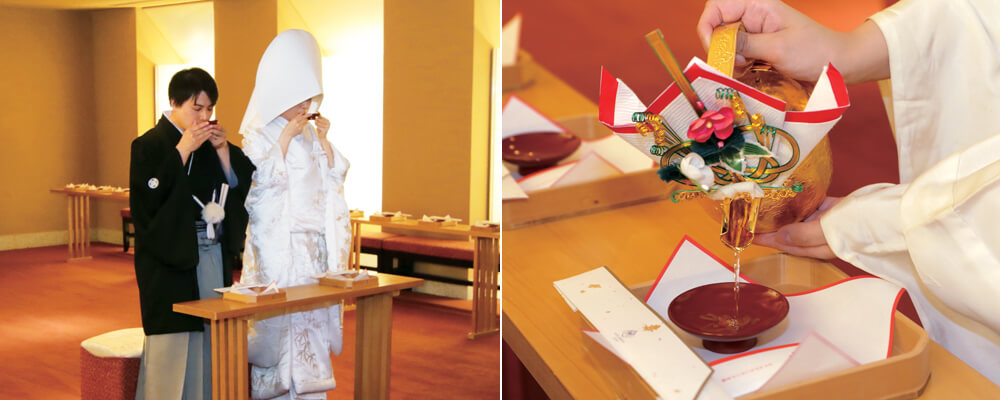 ホテル館内にある「稲寿殿」で、凛とした空気に包まれ、執り行った神前式