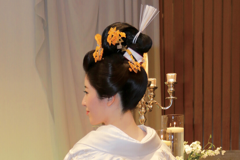 地毛で日本髪を結い、髷のみ付け毛をつけて。日本の花嫁らしい古典的なスタイルにこだわった