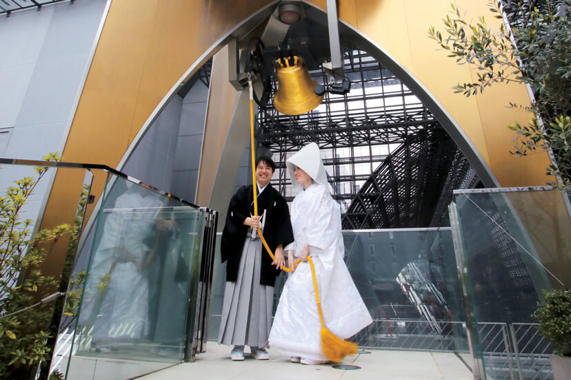 京都駅を通る度にいつか鐘を鳴らしてみたかったという新郎。夢が叶った瞬間