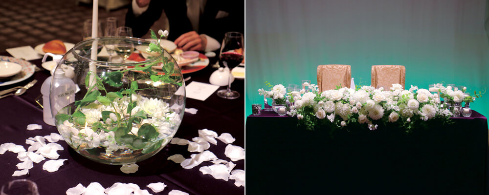 ふたりが好きなパープルのクロスに、装花はすべてホワイトで統一。ホテルウエディングらしい上品さにこだわってコーディネート